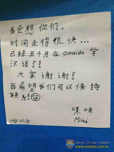Mimi has just finished her comprehensive Chinese course. During her stay at Omeida, her Chinese has improved enormously because of her enthusiasm and the help of the people around her. Goodbye! Wish you all the best!
