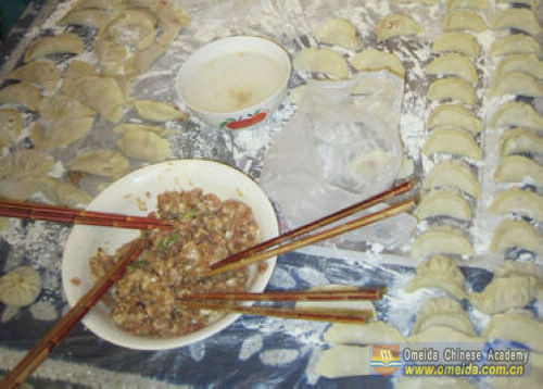 At this party, Chinese teacher taught all the students how to make dumplings. So all of them had a sense of achivement when they were eating delicious dumplings .