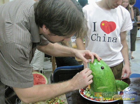 Our 'artist' is carving, can you image the watermelon in his hand will become a 'shark' later?