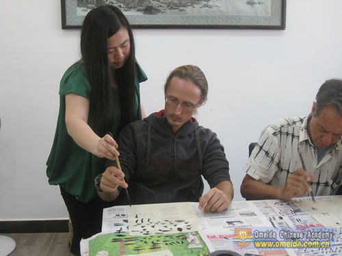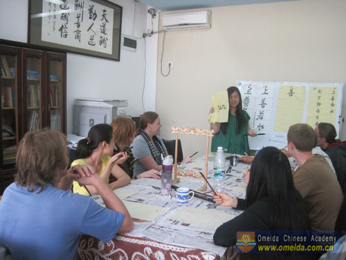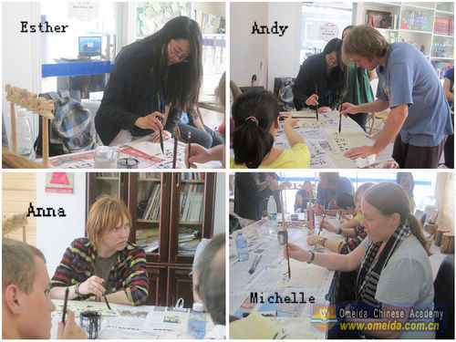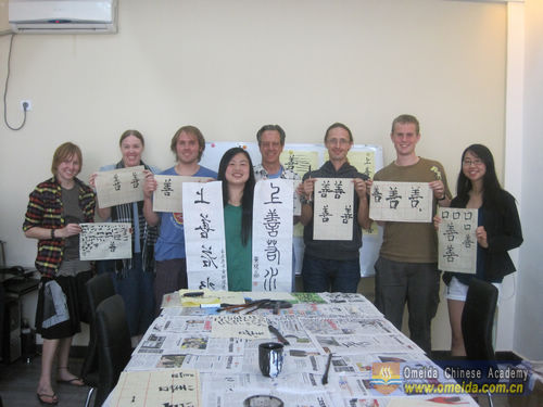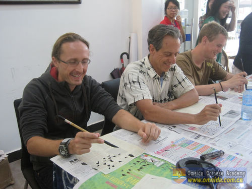 And later, all the students tried to write the character in Chinese one stroke by one stroke.