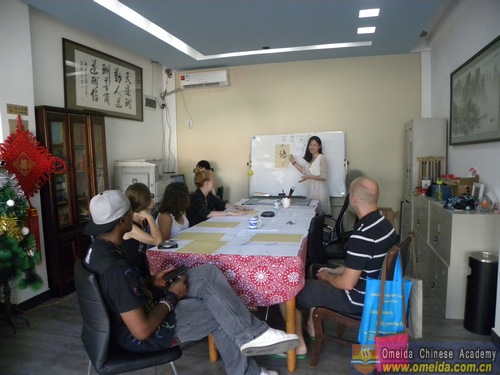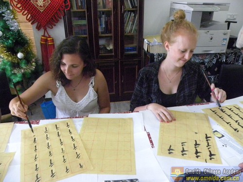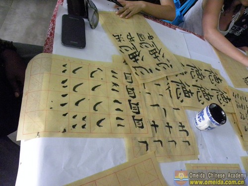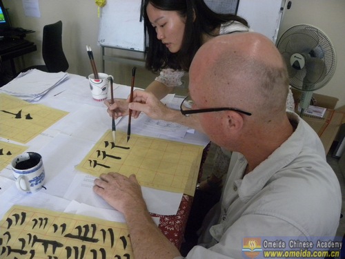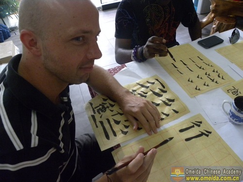 Learning the radical of the character. Magic showed Peter how to hold the brush.