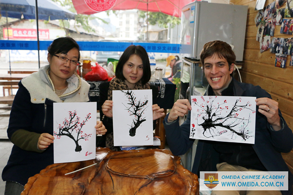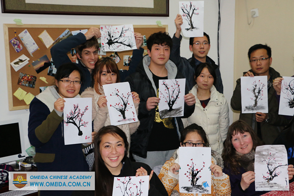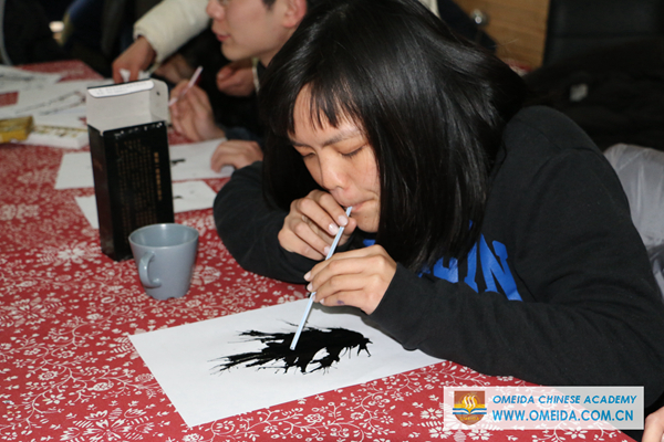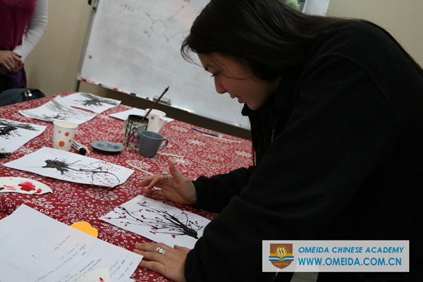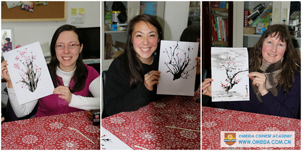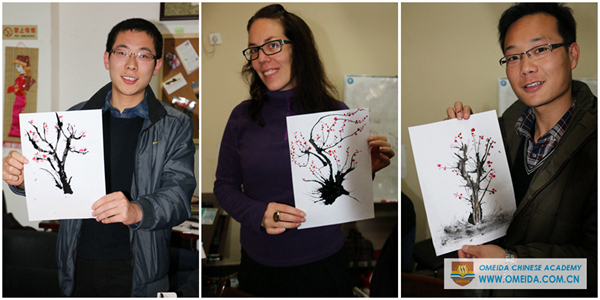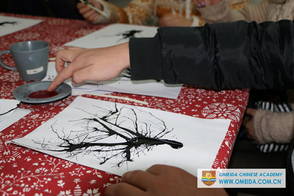 Students in Chinese Academy had art course this week with their language partners. After the brief introduction of Chinese ink blowing, we started our work on the painting only with paper, ink and straws. Blowing the ink to draw the plum tree and using fingers with red ink to draw the plum flowers are the main steps to finish an ink blowing.