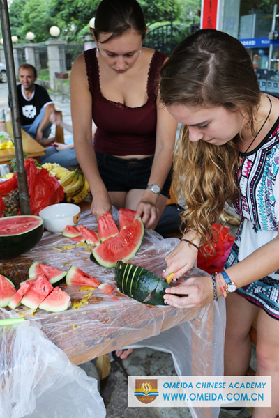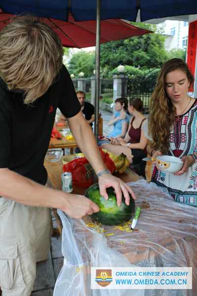 Roast duck, soup, and food for BBQ, everything was already. We invited students in both colleges to prepared together and assigned several people to clearly defined jobs. It was the first time for Tom to join our Saturday activities. He managed to make a fire for BBQ. Florian and Millie prepared much enough fruits for we all. It was the last weekend for Allan in Omeida. Thank your for your coming and wish you all best in Australia. Free talk after BBQ and enjoy such a cool night. Overall, it was a great afternoon/evening with great food, great people, and great weather- what more could you want?