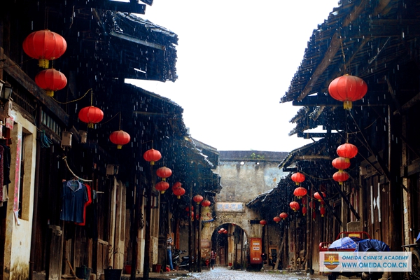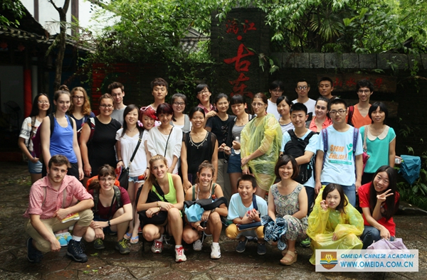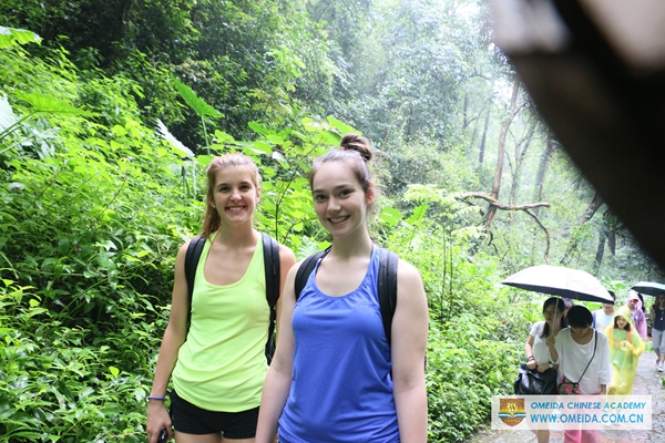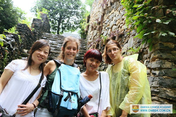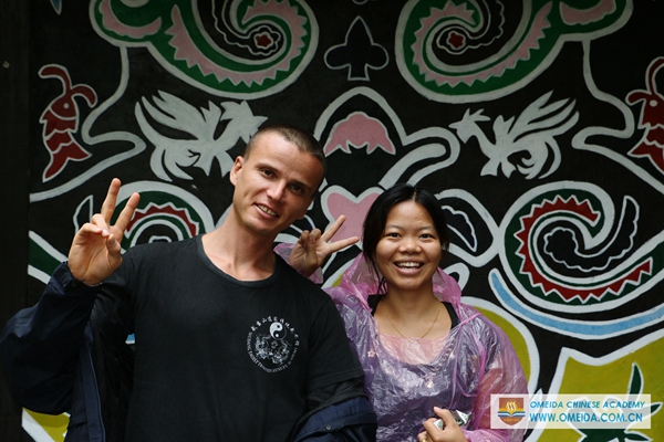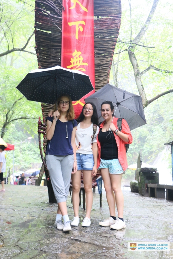 We organized students to visit Gudong waterfall and Daxu ancient town in Guilin. Daxu ancient town is famous for the wooden house with traditional red lantern. It’s a different view in a rainy day. Igor comes from Russia and it was his first time to join us. Catherine and Amelie’s last day in Yangshuo, we’ll never forget the time with you all Canadian students at Omeida. Ele and Sara were with their language partner. There is a longest grass shoe at the foot of the mountain. These wind chimes standing for good luck are made of bamboo. It was a pity that we couldn’t climb the waterfall because of the heavy rain. But we all are looking forward the activities for next weekend.
