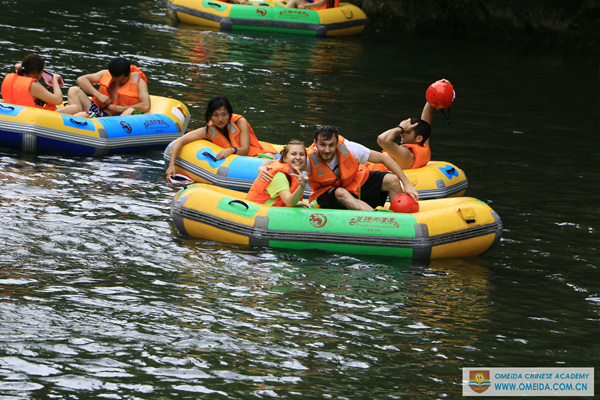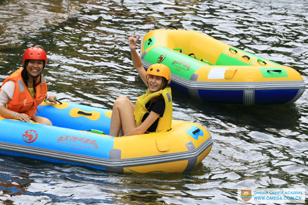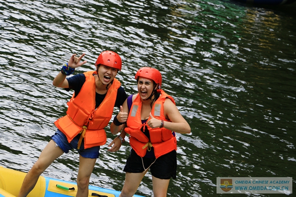 After 1 more hour by bus, we arrived Longjing River. Firstly, you need to change the safty shoes prepared by the travel agency in case your shoes will fall down to the river. When you get at the top of mountain, you should wear red life jacket before rafting. Thirdly, everyone should find a partner share a raft to keep balance, or you will be upside down and fall into the river.