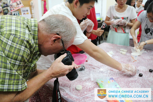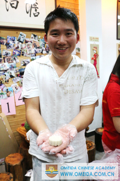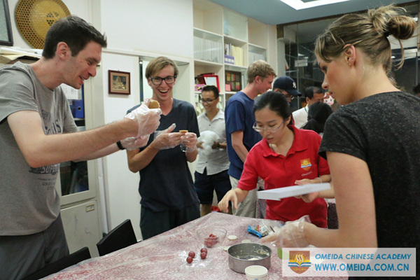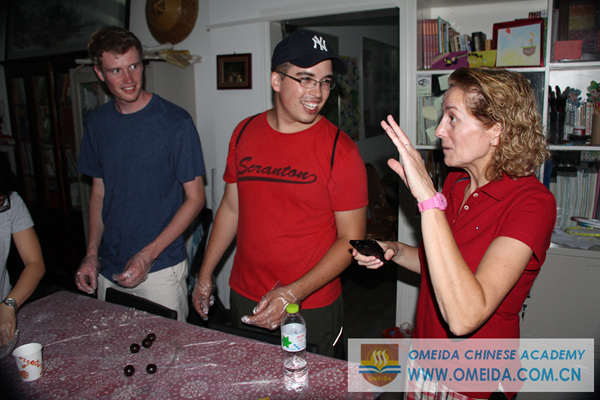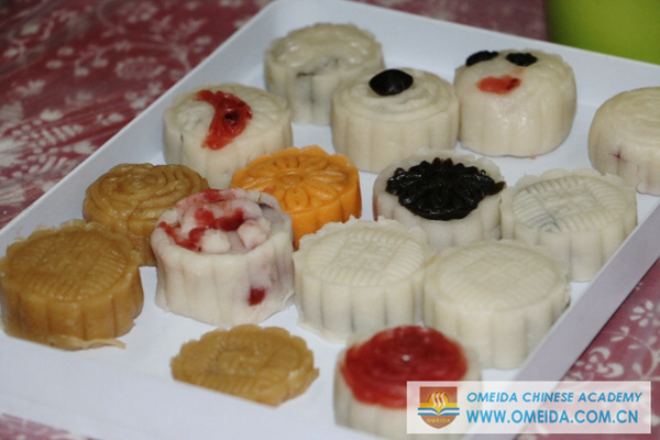 As darkness fell on Monday night, we met at school and prepared everything for the festival. The first step was to make snow moon cake together. Adding some water to the well-cooked rice flour and rolling to the shape of the small balls, all these will used for the outside parts. Bean paste made into the same shape will be used to the inside part as same size as the outside parts. Covering the bean paste inside and using a mold for decorative pattern on the cake, a snow skin moon cake has already done.