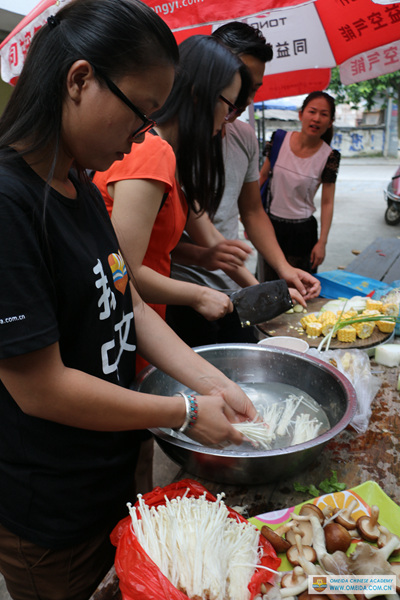 During the cultural course of Chongqing hot pot, our Chinese teacher Zhuge is washing a kind of mushroom(金针菇).