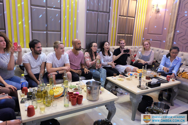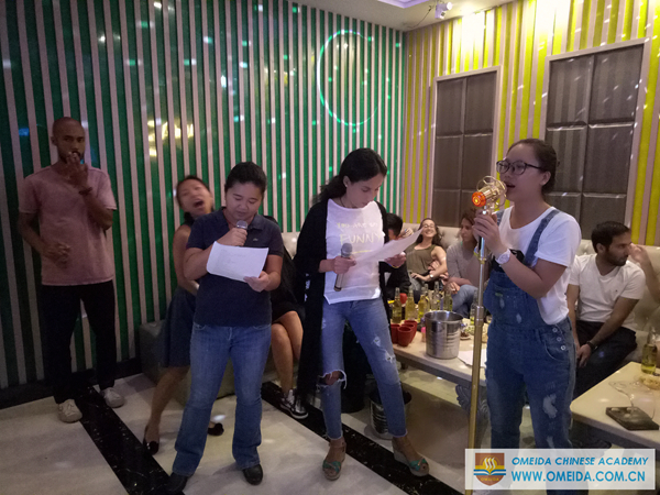 This was an international Karaoke. Our students are from Spain, the United States, Netherland, Russia, Sweden, Brazil and Israel. They were very good at singing Chinese songs. It was not just a way to relax it was another way to learn Chinese. Some of them could remember the lyrics. And some sang with their teachers. Teachers are proud of their students. Students showed their language learning talent. They made us a wonderful night. Also, it was the last night for David(大卫) and Bouchra(布莎) who graduated from Omeida today. In a word, It was a lot of fun.