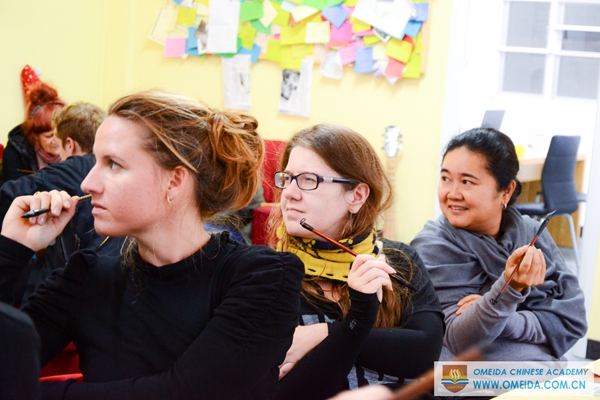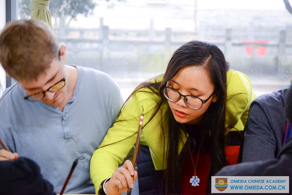 Last week Wednesday, we had our Chinese teacher Zhuge at student lounge giving a Chinese calligraphy class. Zhuge is a talented and knowledgeable Chinese teacher and she is very good at Chinese calligraphy. In the class, Zhuge gave us a presentation of Chinese calligraphy, talked about笔bǐ墨mò纸zhǐ砚yàn which called “ scholar's four jewels ” ( writing brush , ink stick , ink slab and paper ). Our calligraphy class started with two short stories which told by Zhuge. At the meantime, she brought us her 福fú. 福fú has arrived at Omeida. Good luck is coming to everybody.